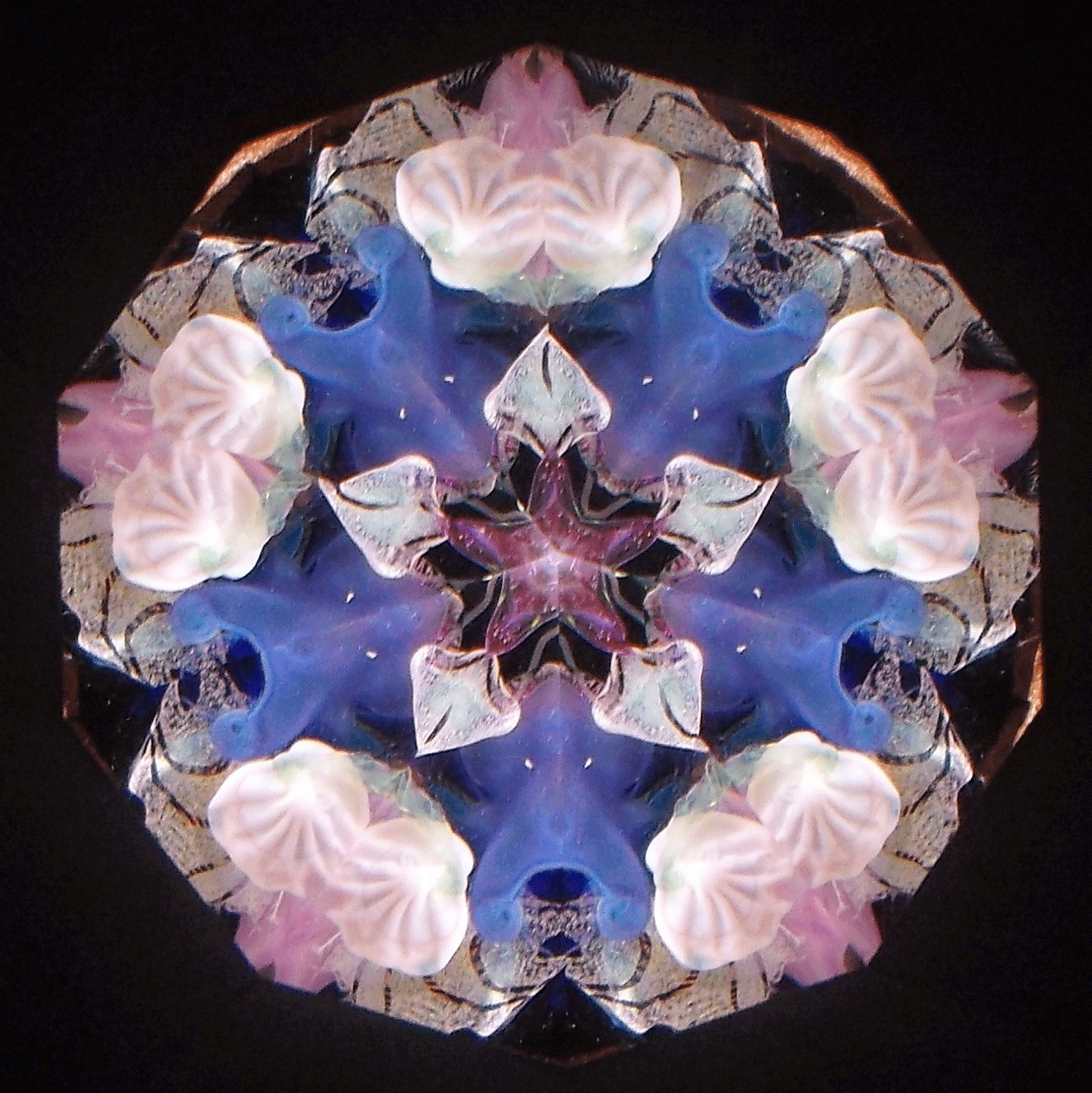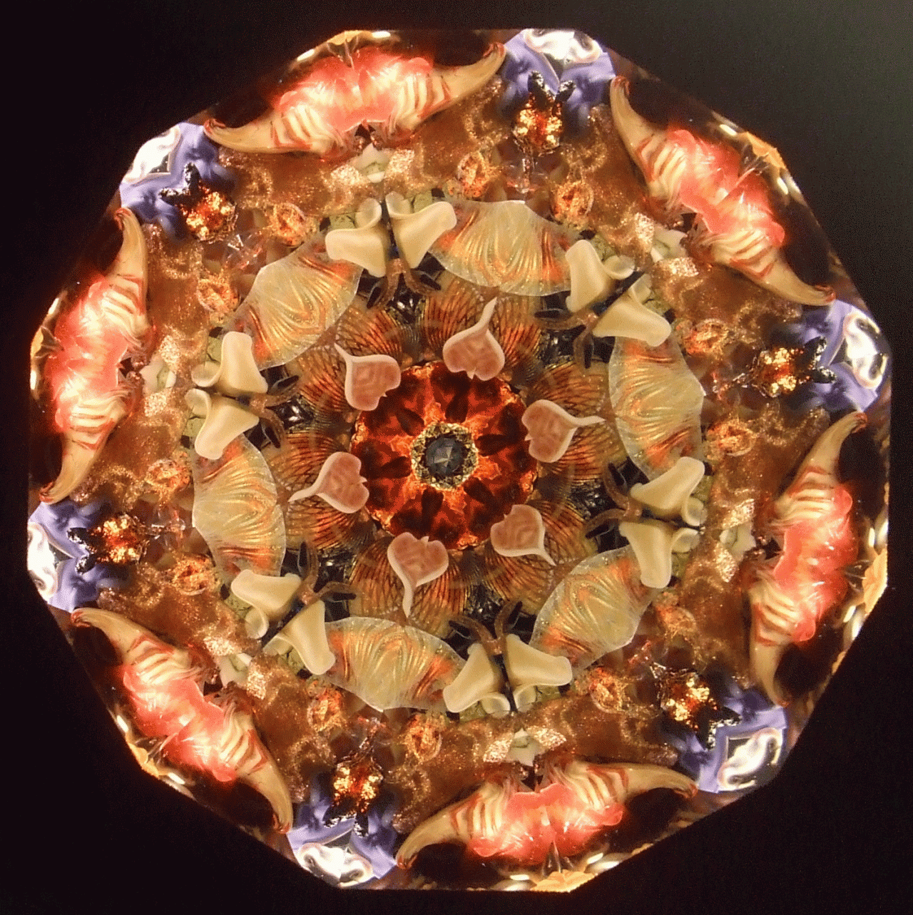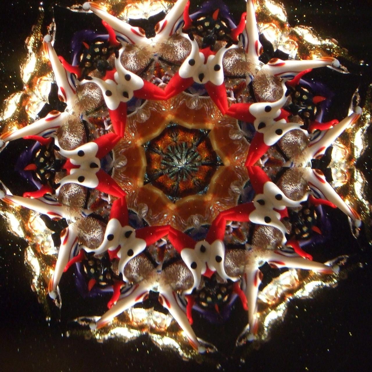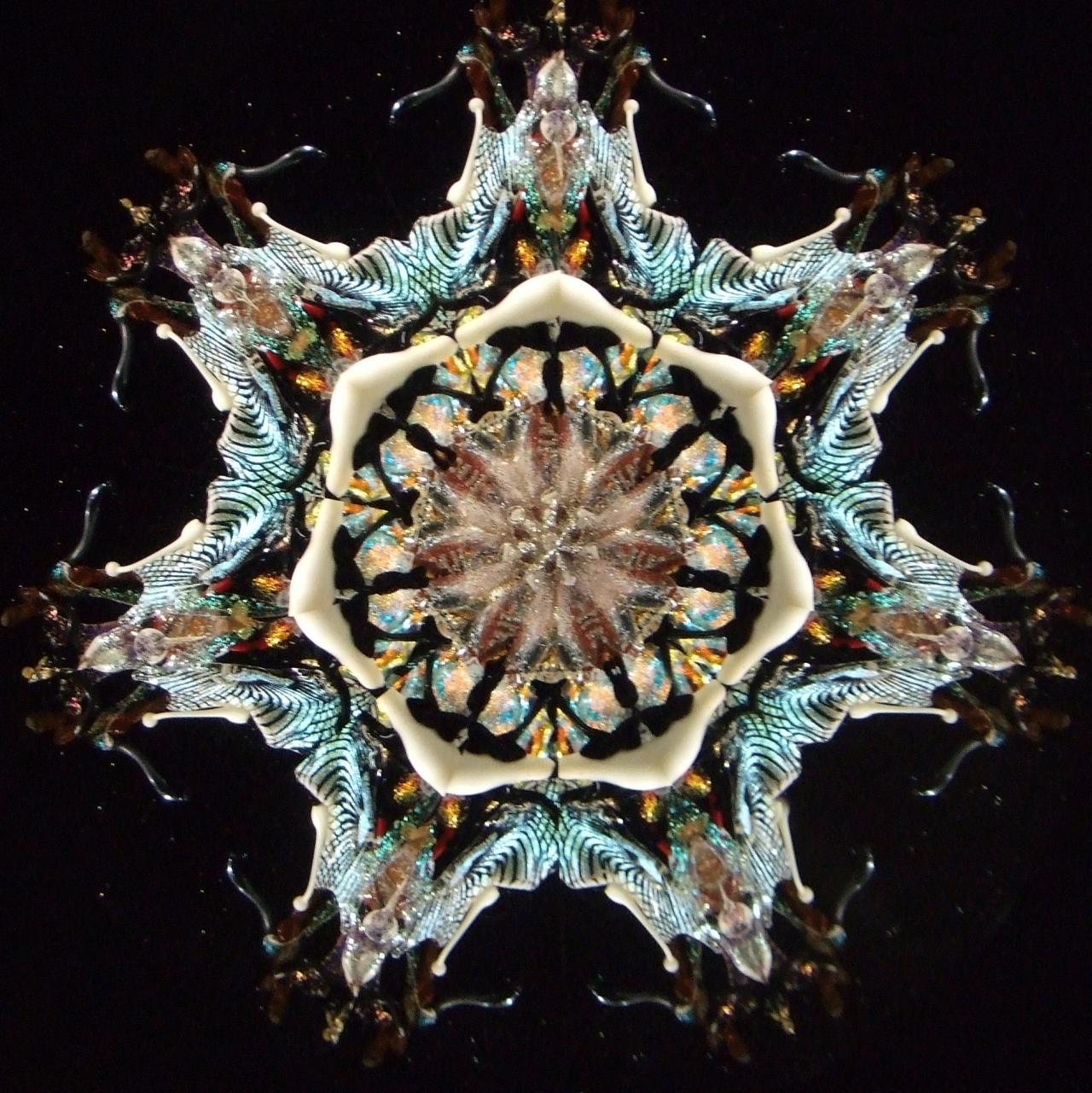Peggy's flame sculpted pieces found in the oil filled object cells create magic for the viewer. No two object cells are alike, and as the pieces float in the cell, no two views are ever alike. The variety of mirror systems available also changes the look. Below is a small sample of images. You can click on the images for larger views. You can contact us and talk to Peggy about creating just the right object cell for your preferences!