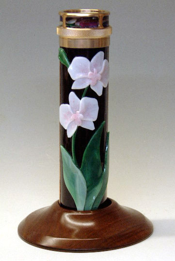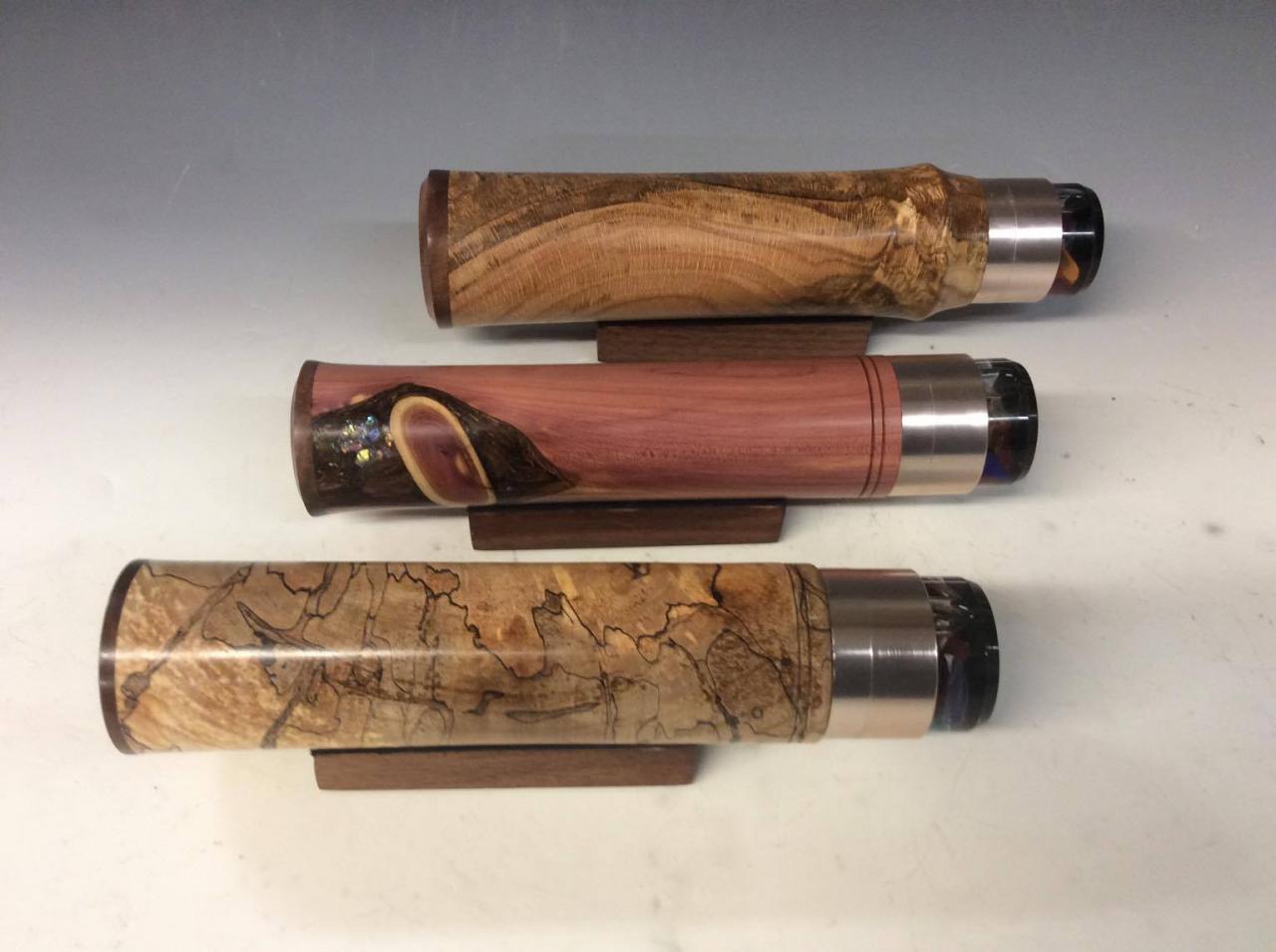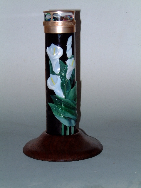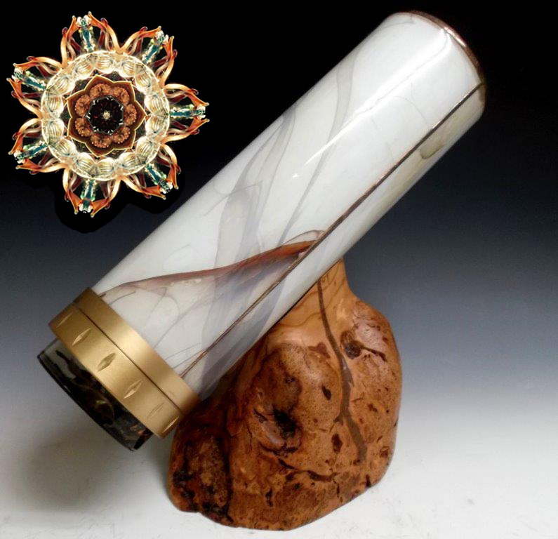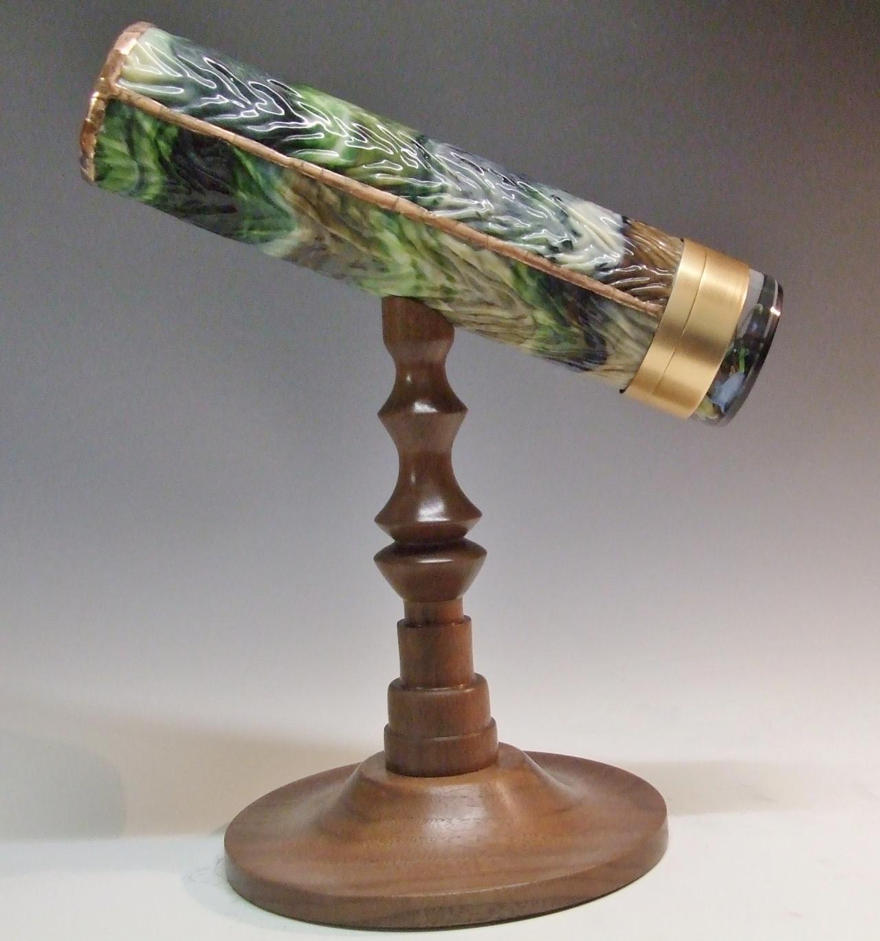 We know that kaleidoscopes are very personal and need to be seen to to connect with. This year, we will be creating the scopes to YOUR personal preferences. We are happy to discuss all of those details with you when you contact us. *CLICK on the thumbnails to see a bigger picture and some details along with the price. NOTE: There are some wood barrels at the bottom of the page that are turned and ready for customization. All handheld scopes come with a walnut stand to lie on and all flower scopes come with a turned round walnut stand.